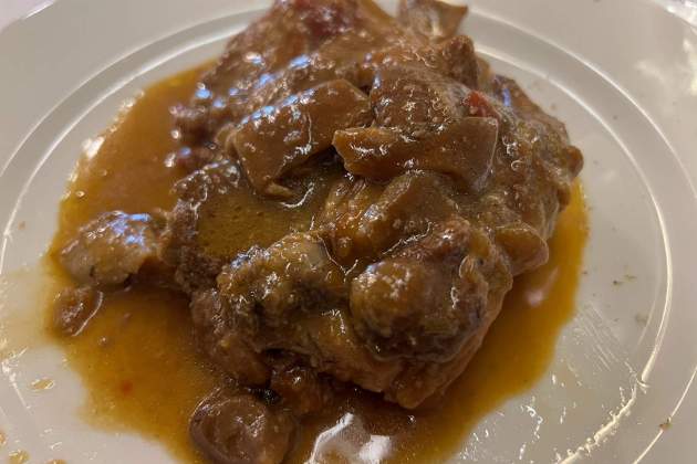 Però nosaltres ens debatem entre els lletons de xai saltats amb alls tendres i els cervells de cabrit a la romana, i triem els primers, petits, picats, tendres i amb tot l’aroma dels alls. A més, a banda de la bona brasa, Can Xarina és ben conegut pels guisats, i en aquest dissabte d’agost gairebé a cada taula fumeja una cassola de pollastre amb llagostins, peu de porc amb ceps, cua de bou amb fruits secs o, davant meu, de conill amb ous de reig.