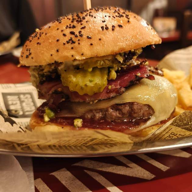 Tornem ara al punt fort d’aquest restaurant, les seves hamburgueses, que combinades amb la gran creativitat de l’equip i l’esforç per trobar sinergies especials, serà difícil no sortir sorpresos. Aquí parlarem de dos en particular, primer, l’especial de la casa, una hamburguesa que ha conquerit la carta des de fa més de dos anys, la Doña Pistacha. Sabem que el festuc s’ha posat molt de moda últimament, però aquí no els trobarem gens embafadors gràcies a la seva combinació de pastrami de black angus, allioli trufat, cogombrets envinagrats, confitura de Pedro Ximènes, formatge i una carn de vaca madurada 50 dies.