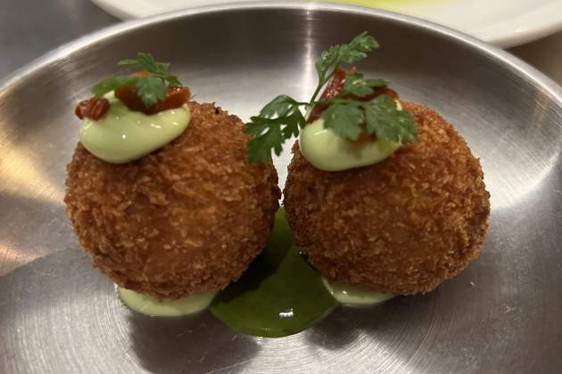 Durant la visita, asseguda a la barra, també tasto les vieires amb carabassa i un brou de mar i muntanya, una combinació perfecta, iodada i gustosa, amb el matís dolcenc de la cucurbitàcia. La llengua tonnata amb pebrot escalivat quedarà per a la següent, però ataco amb gana els porros confitats amb festucs, scamorza affumicata i ruca, una recepta que fuig completament d’aquells porros massa nus, que es presenten només enfornats i sense res que els aporti gens de gràcia especial.