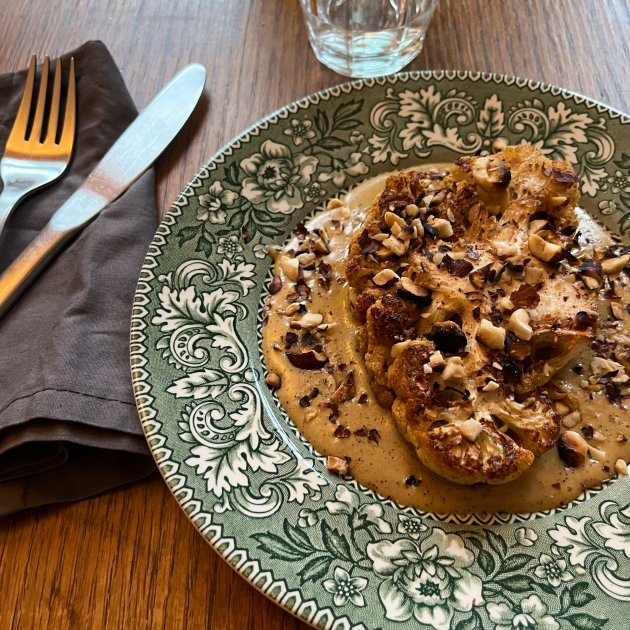 Holandesa de cafè amb coliflor rostida i avellanes torrades