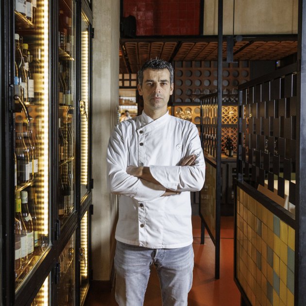 Mateu Casañas, xef del Disfrutar, davant la vitrina on es mostra una part dels vins que ofereixen. / Foto: Sergi Alcàzar