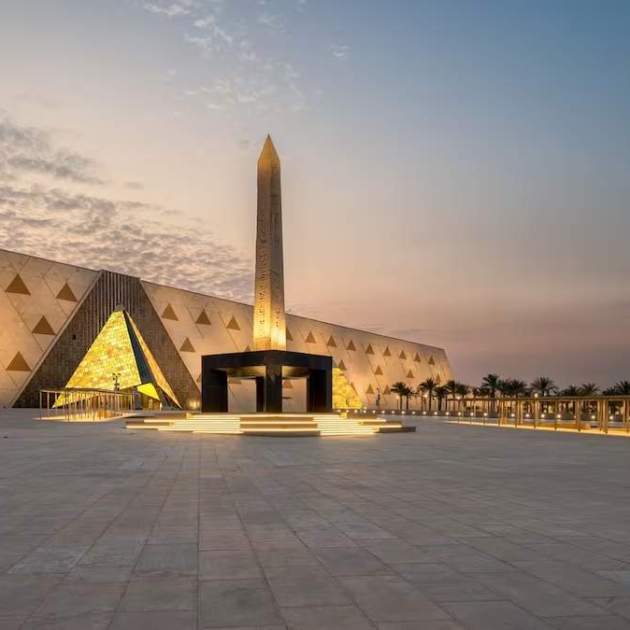 El recorregut comença de manera gairebé teatral. Després d’una entrada estreta, el visitant accedeix al Gran Vestíbul, un espai immens inundat de llum natural i presidit per una estàtua colossal de Ramsès II, de nou metres d’alçada i vuitanta tones. A l’exterior, un obelisc penjant de 16 metres sembla flotar sobre el terra, permetent caminar-hi per sota i veure’n la base. Des d’aquest punt central, s’enfila la Gran Escala, una avinguda interior de sis pisos i 6.000 metres quadrats que guia el visitant a través de més de seixanta estàtues, sarcòfags i fragments monumentals. L’ascens culmina en una gran finestra panoràmica que enquadra les piràmides de Giza.