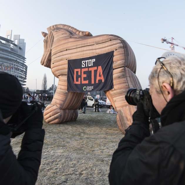 Mentrestant, en l'exterior de la seu europarlamentària a Estrasburg les plataformes contràries a l'acord de lliure comerç i que critiquen l'opacitat de les negociacions han dut a terme una protesta pacífica que ha dificultat l'arribada d'eurodiputats a la sessió. Entre els manifestants, també hi havia l'eurodiputat Josep Maria Terricabras, que hi ha votat en contra.