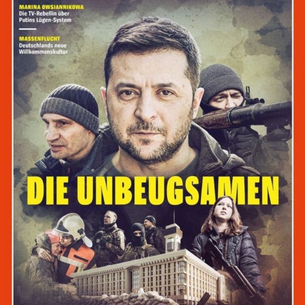 El setmanari Der Spiegel, considerat el més important d'Alemanya, ha mostrat en la seva portada d'aquesta setmana la seva admiració pels ucraïnesos. La portada porta per títol "Els indomables", i afegeix que han "desafiat la superioritat russa". El mite bíblic de David contra Goliat, que recorda la batalla que es va viure a la vall d'Elah fa uns 3.000 anys, segueix funcionant al segle XXI. A la portada hi apareix amb un aire cinematogràfic el president d'Ucraïna, Volodímir Zelinski, acompanyat de l'alcalde de Kíiv, Vitali Klitschko, i envoltats de població armada i bombers en accions de rescat. A dins la revista, Der Spiegel presenta el president d'Ucraïna com un "Churchill amb folre polar". "Putin apareix sempre amb vestit clàssic i parla amb odi, Zelinski vesteix de color verd oliva i parla amablement però amb fermesa. Ara depèn d'ell que el seu país aguanti en aquesta guerra", apunta.