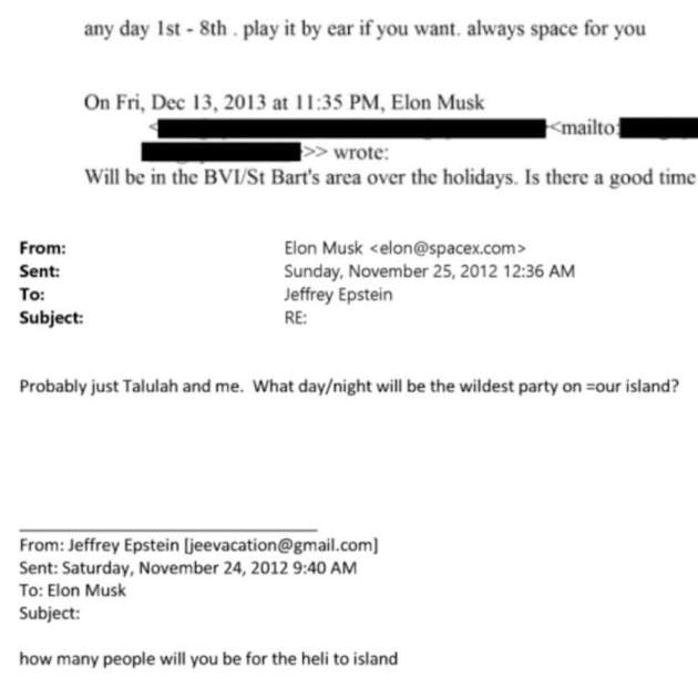 El magnat tecnològic Elon Musk va preguntar a Jeffrey Epstein “quin dia serà la festa més salvatge a la teva illa?”, segons consta en un correu electrònic revelat aquest divendres en una desclassificació massiva de documents del Departament de Justícia dels Estats Units. El missatge forma part d’un arxiu d’enormes dimensions —més de tres milions de pàgines, 180.000 imatges i prop de 2.000 vídeos— que aporta nou context sobre les relacions i comunicacions del pederasta multimilionari, mort el 2019. En un intercanvi previ, Epstein demanava quantes persones caldria preveure per preparar l’helicòpter a l’illa privada, a la qual cosa Musk responia que només “Talulah i jo”, en referència a Talulah Riley, actriu i escriptora britànica amb qui el magnat es va casar en dues ocasions.