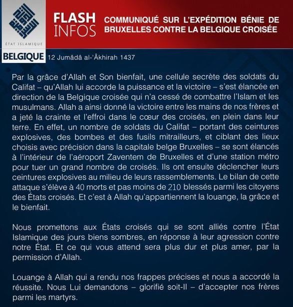 L’Estat Islàmic ha estat l'autor dels atacs d'aquest matí a Brussel·les. Així ho ha reivindicat en un comunicat en què amenacen amb "dies ben foscos" als estats "aliats contra l'EI" i donen les gràcies a Al·là per donar-los "el poder i la victòria". Ho han fet en anglès, àrab, rus i serbi, en la sempre voluntat clara d'internacionalització del seu missatge.