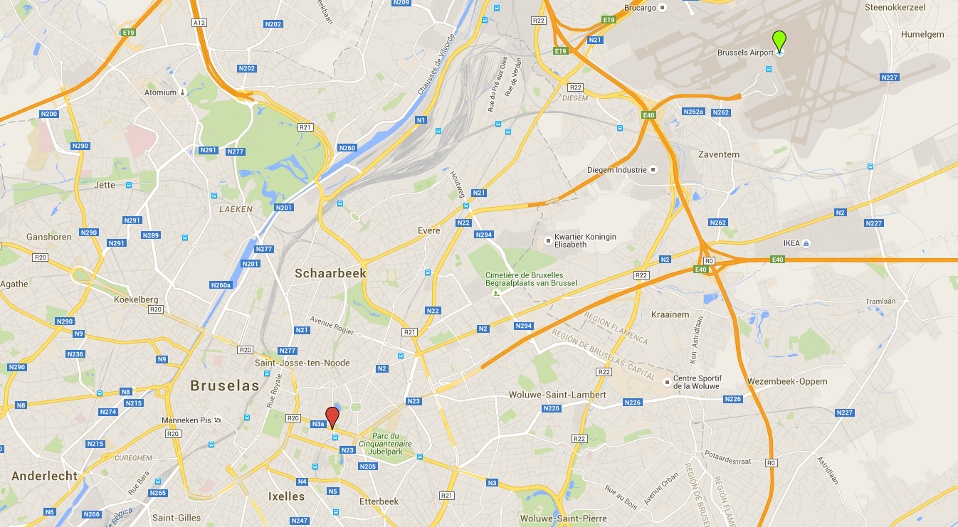 Mapa de Brussel·les. El punt vermell és la parada de metro de Maelbeek i el verd és l'aeroport