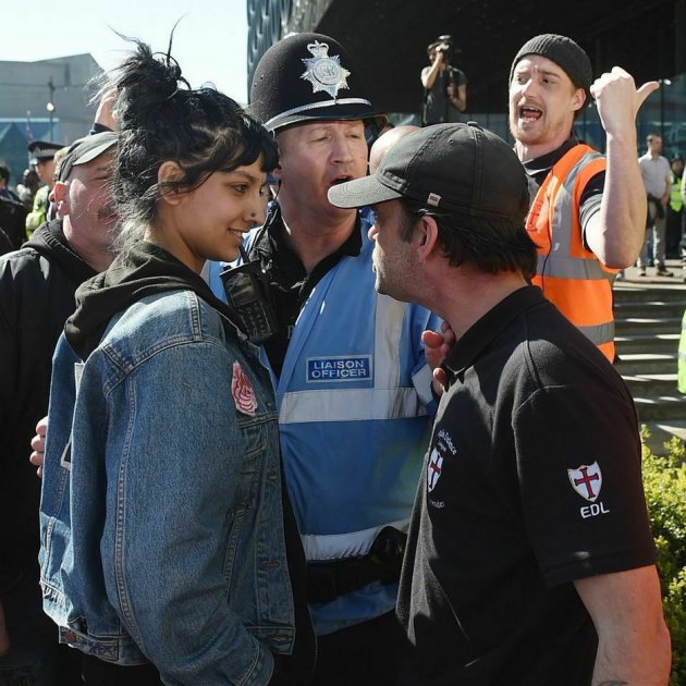 A la imatge s’hi pot veure Saffiyah Khan somrient a Ian Crossland, líder del grup d'extrema dreta English Defence League (EDL). Els fets van passar dissabte a Birmingham durant una manifestació organitzada per l'EDL com a resposta a l'atemptat a Londres el 22 de març. El fotògraf Joe Giddens va ser l’encarregat de capturar la instantània.