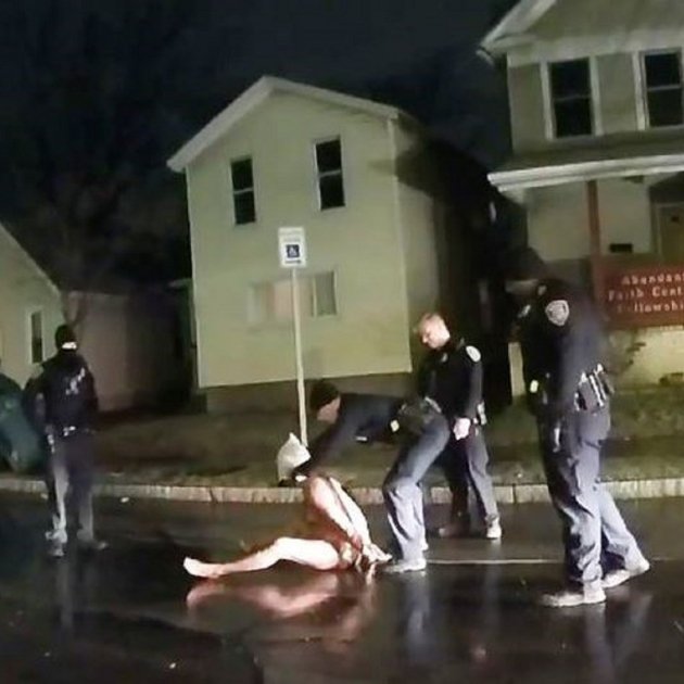 Foto principal, frame del vídeo policial on es pot veure Daniel Prude, nu i amb una caputxa, al costat d'agents policials