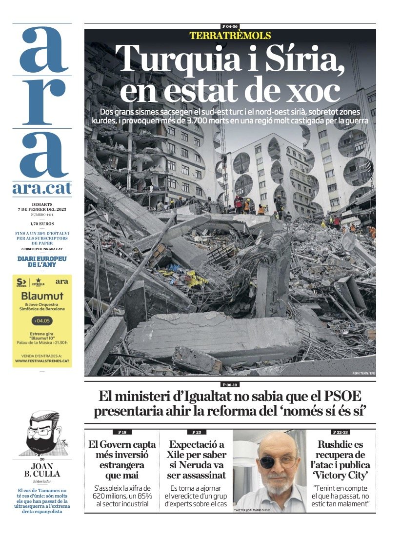Quin cor més negre han de tenir a La Razón per seguir amb la matraca contra el govern espanyol de coalició el dia que toca parlar a tot drap del terratrèmol a Turquia i Síria. Que són gairebé quatre mil morts i més de tretze mil ferits quan això s’escriu i molts més ara que ho llegeixes. S’han ensorrat prop de sis mil edificis només a Turquia. En una regió devastada per totes les crisis imaginables: la pobresa, els refugiats, la repressió contra els kurds que hi viuen, la guerra. El de dilluns era un consell de redacció fàcil, de cinc o deu minuts per decidir quins racons de la primera pàgina quedarien per la resta de fets rellevants del dia i deixar la sala buida per a que els especialistes en fotografia triessin la imatge de la tragèdia. Però no. A La Razón, la dèria partidista ha passat per sobre de la realitat del dia i aquí tens al diari del Grupo Planeta obrint portada amb la picabaralla entre ministres del PSOE i de Podemos per com es reforma la llei del “només sí és sí”. Quina gent tan obtusa i toixa.