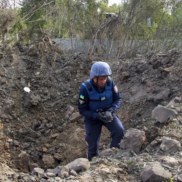 Imatge principal: un policia ucraïnès inspeccionant una bomba que ha detonat a la regió de Khàrkiv / Efe