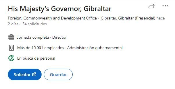El Regne Unit busca un nou governador de Gibraltar a LinkedIn, la xarxa social orientada a les empreses i l'ocupació laboral. Així consta en el perfil a la plataforma de l'Oficina d'Afers Exteriors, Commonwealth i Desenvolupament, que ha publicat l'oferta de feina aquesta setmana. Fins a aquest divendres, l'oferta ha acumulat més de cinquanta sol·licituds. És possible que entre aquestes persones hi hagi el successor de David Steel, l'actual governador de Gibraltar. De fet, qui surti d'aquest procés serà el segon governador sota el regnat de Carles III.
