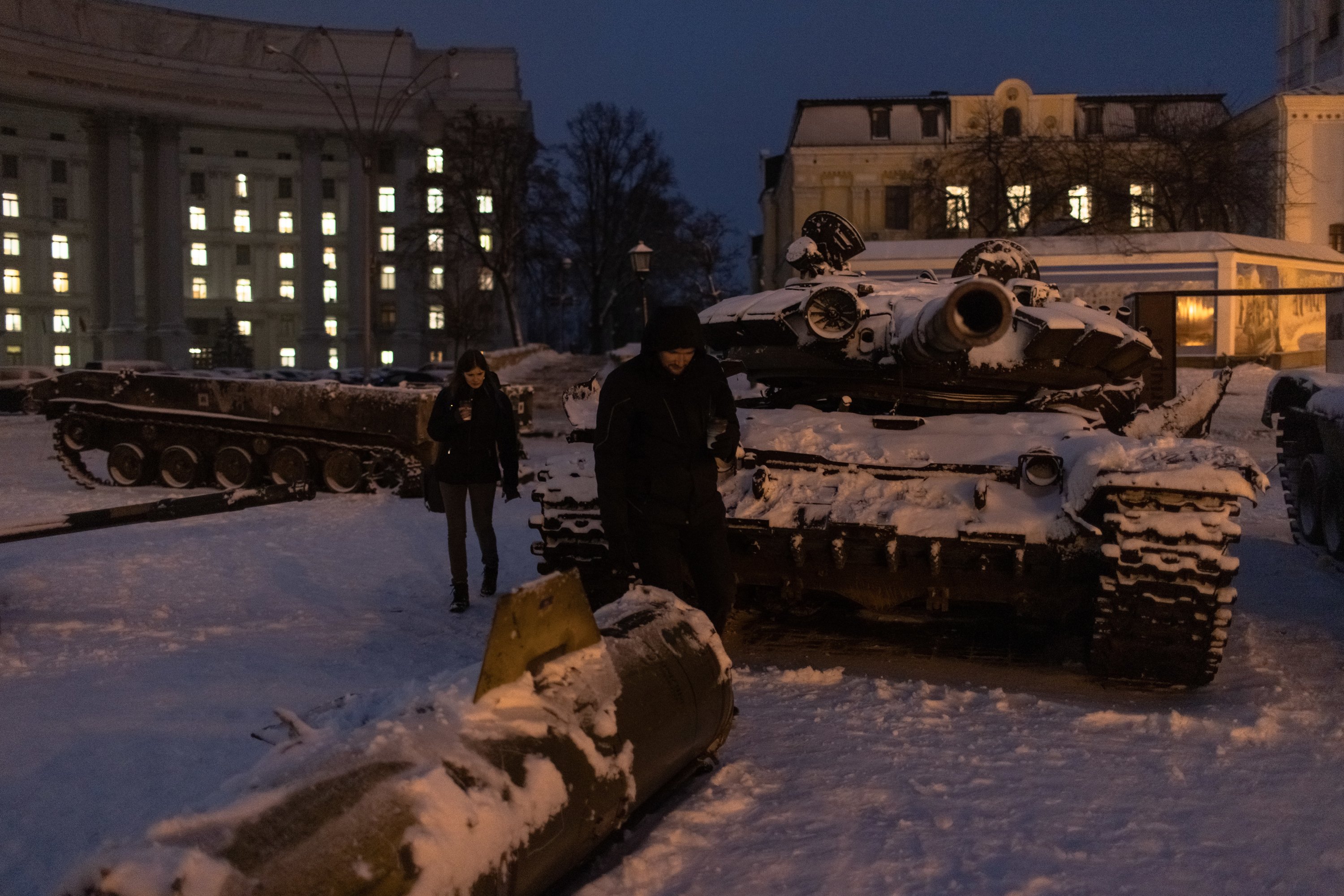 Imatge principal: Dues persones travessen una plaça de Kíiv on l'exèrcit ucraïnès ha exposat alguns dels vehicles russos que han recuperat destrossats durant la defensa contra la invasió de Rússia. Foto: Roman Pilipey / Efe