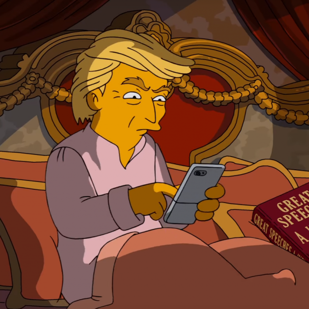 Primer, el magnat rebutja contestar la trucada d’avís de la crisi que hauria esclatat, perquè està escrivint un tuit a Elizabeth Warren, una política demòcrata molt crítica amb ell. Després, ara sí, respon la trucada, però abans de fer res per solucionar el problema necessita que un equip d’esteticistes el maquilli –fins a límits insospitats–, i que li posin la perruca. Quan ja està preparat per actuar, la flota xinesa avança i aleshores afirma que cal posar un mur... a l'oceà.