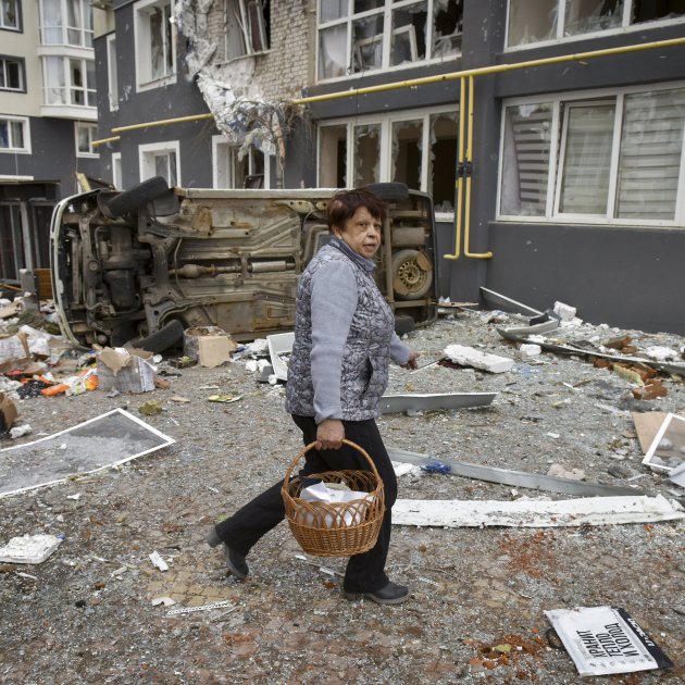 Imatge principal: una dona porta menjar en un cistell al costat d'un edifici malmès a Butxa, prop de Kíiv / Efe