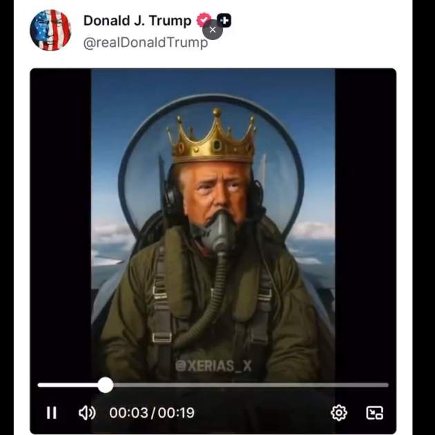 Anteriorment, ja havia publicat un altre vídeo generat per IA en el que es veia a Trump participant en una cerimònia de coronació, amb gent agenollant-se davant d’ell. El dirigent nord-americà havia dit divendres, en una entrevista amb la cadena Fox News, havia rebutjat la comparació amb un monarca. “Diuen que es refereixen a mi com a rei. No soc un rei”, va declarar el president. Però posteriorment, va decidir aprofitar les crítiques per girar la truita i aprofitar-les per respondre als milers de protestants contra les seves polítiques. A les xarxes socials el seu equip i els activistes MAGA han difós imatges i vídeos de Trump portant una corona, marcant així el perfil de rei que està per damunt de tothom.
