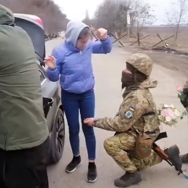 La futura promesa viatjava amb un cotxe amb altres persones en ruta cap a l’exterior de la capital, en direcció cap a la frontera amb Europa, a la zona de Polònia. L’escamot militar del qual forma part el futur marit, va aturar el vehicle, va fer sortir-ne tots els ocupants, i després de fer-los posar de cara al cotxe i amb les mans sobre el vehicle, els van escorcollar. L'ensurt va ser gros, i no és per menys, estan en zona de guerra i són assaltats per un grups de militars armats amb armes llargues, material de protecció i les cares tapades si bé portaven un identificatiu de color groc, el que marca a les tropes locals, però els darrers dies s'han viscut també situacions de perill quan militars enemics s'han fet passar, amb uniformes de la resistència, per causar baixes entre els ucraïnesos.