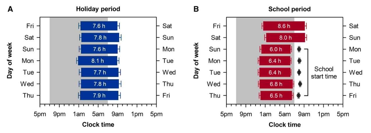 Segurament, no us sorprendrà que els seus resultats indiquin que hi ha un canvi significatiu entre els patrons de son-vigília dels dies d’escola respecte als caps de setmana. Les nits dels dies lectius, els adolescents estudiants se’n van a dormir més d’hora (al voltant de mitjanit) que les nits del cap de setmana (al voltant de la una de la matinada), però també s’aixequen molt més d’hora, cap a les 6 del matí, mentre que el cap de setmana s’aixequen cap a les 9 del matí. A mesura que els adolescents es fan més grans, van a dormir una mica més tard (de mitjana, 15 minuts més tard per any), però s’aixequen a la mateixa hora. En conjunt dormen unes 6 hores i escaig entre setmana i una mica més de 8 hores el cap de setmana. De fet, el comportament de son-vigília del cap de setmana és assimilable al de les vacances, en què no hi ha constrenyiment horari i els cicles de son-vigília són més regulars.