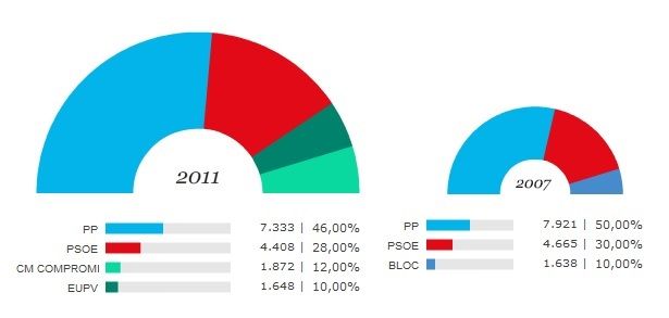 Queda clar que Alfonso Rus no va arribar a alcalde obtenint un vot més que el seu gran rival, ni gràcies a un pacte de 5 partits. No, no, guaiti les xifres, guaiti. El 2007 el van votar un 50% dels habitants de Xàtiva i el 2011 un 46%. Molt descontents no devien estar amb ell, no?