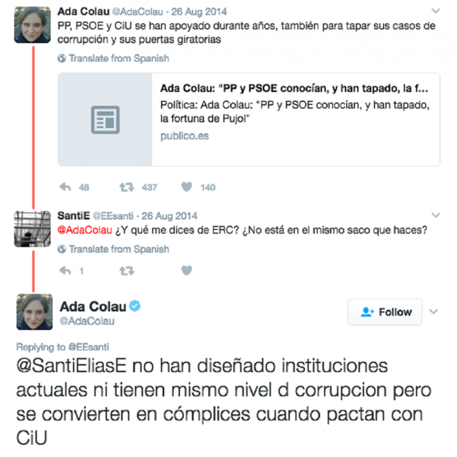 L'altre dia, vaig trobar per casualitat aquest tuit d'agost del 2014 de l'actual alcaldessa de Barcelona i llavors impulsora del que és ara Barcelona en Comú, en el qual responia a un usuari que preguntava sobre la implicació d'ERC en el sempre recurrent cas Pujol, el comodí favorit dels ximples útils contra l'independentisme: