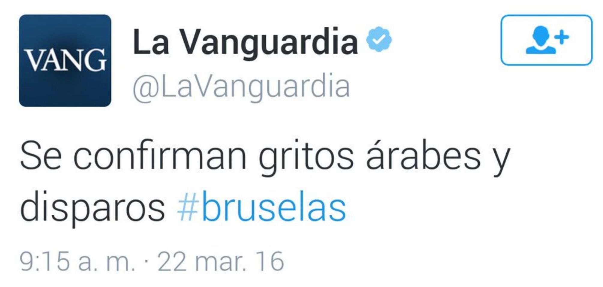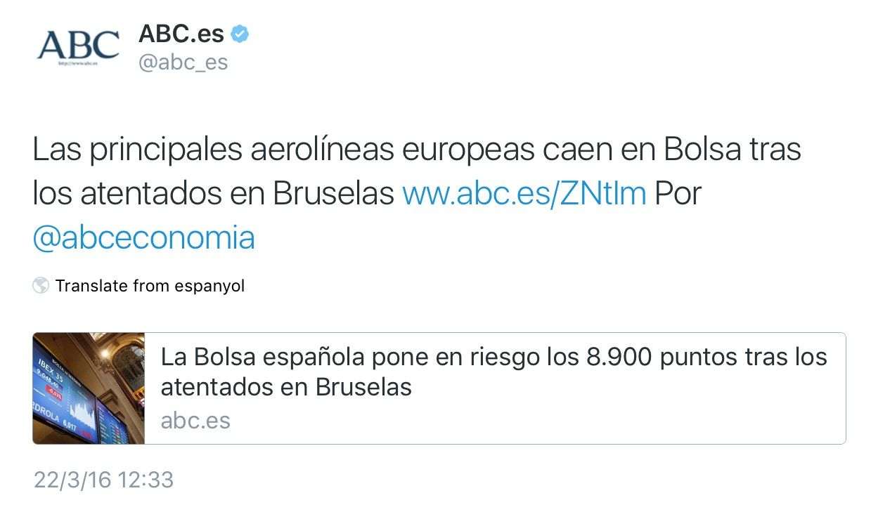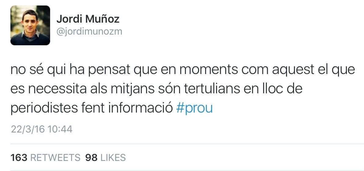 I, de sobte, un atemptat. A Brussel·les. Ràdios i televisions estan fent els seus programes matinals. Ràpid, programació especial! Quedi's amb nosaltres que li ho explicarem tot. No tenim ningú a Brussel·les, però tenim Twitter. I les webs dels diaris belgues. I les cadenes de TV internacionals que sí que tenen gent a Bèlgica. I, au, tots a explicar i a repetir el mateix. Som 30 mitjans i tots anem a la mateixa font. I no comprovem res. I després que passi el que passa, que reproduïm imatges d'un atemptat rus de fa anys com si fos el de Brussel·les d'avui. Endavant!