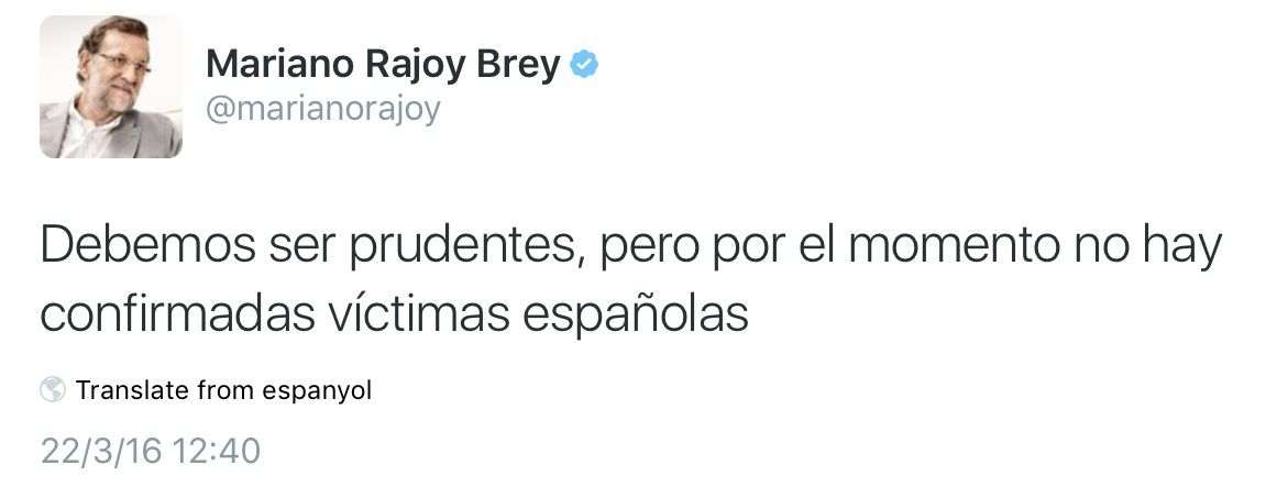 Més de 30 morts al cor d'Europa i cap és espanyol? SEN-SA-CI-O-NAL!!! Ara ja estem més tranquils. Ens ha tret un pes de sobre, senyor presidente en funcions. Ah, però que la prudència no falti mai. Sobretot. Alguna altra informació rellevant?