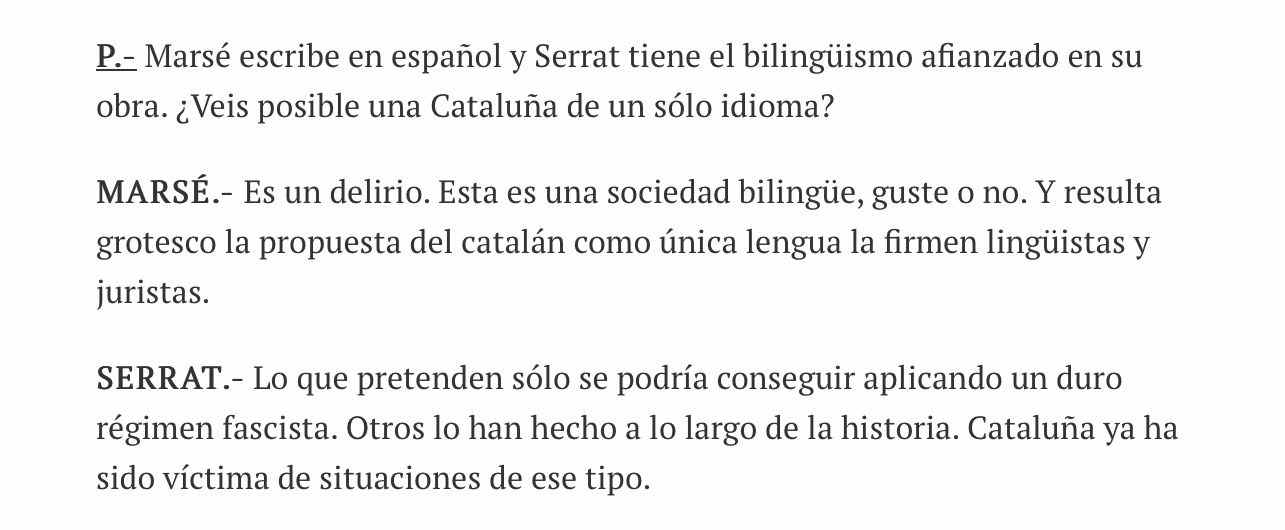 Hi ha preguntes que inclouen la resposta. Hi ha preguntes fetes des d'un supòsit irreal. Hi ha preguntes de ciència ficció. I després hi ha preguntes com aquesta que publicava diumenge passat El Mundo al mig d'una entrevista amb Joan Manel Serrat i Juan Marsé. Si entrevistéssim l'entrevistador, la pregunta seria: algú planteja una Catalunya d'un sol idioma? Si fos així, me'l podria presentar? I si no fos així, se'n podria vostè anar a la merda? Moltes gràcies.