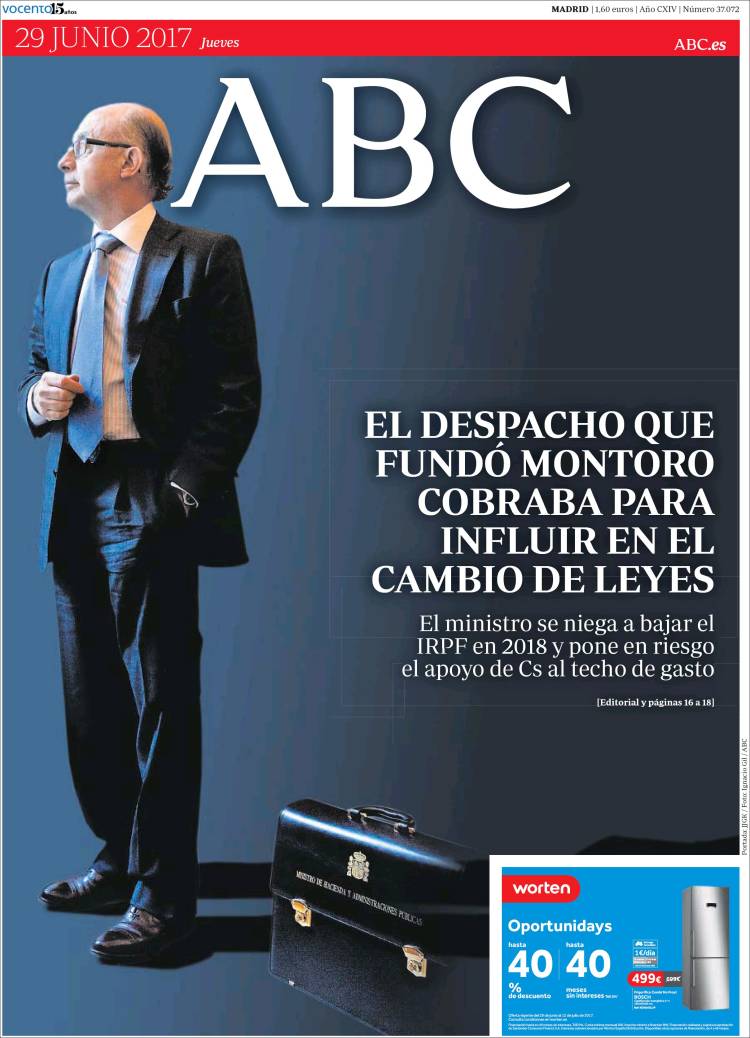 Sorprèn molt que un diari molt (MOLT) pròxim al Gobierno dediqui TRES dies (TRES), la seva portada a un ministre i no precisament per dir-li bonic. Sobretot perquè un d'aquests dies la gran noticia a Madrit (concepte) era la celebració dels 40 anys de les primeres eleccions generals després del franquisme, que van ser la gran santificació d'aquesta monarquia de la qual sempre n'ha fet bandera l'ABC. O sigui, molt gros ha de ser l'enfrontament Montoro-ABC perquè el seu tema passi per davant del Rei (bé, i de la resta) durant TRES dies TRES.