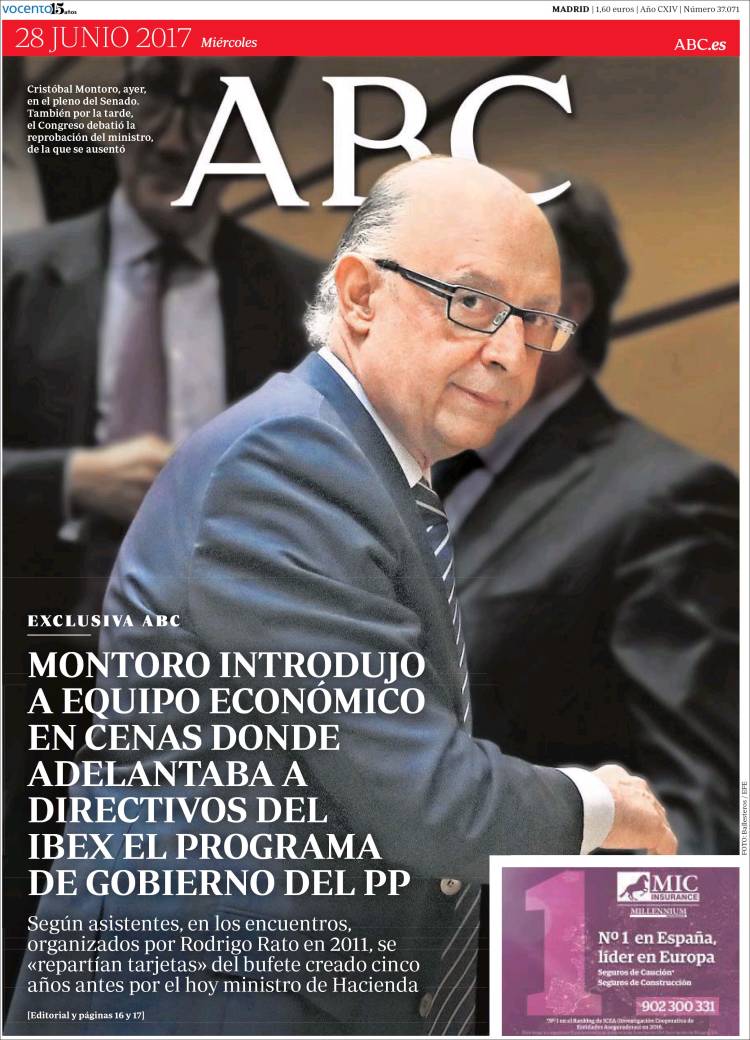 Ningú sap què ha passat exactament, però el cas és que l'ABC tenia una exclusiva sobre un presumpte tràfic d'influències del ministre Montoro i l'ha publicat amb tota l'amplificació que ha pogut. I per triplicat. I posats a especular, potser l'important no sigui la resposta sinó les preguntes: de què és ministre Montoro? D'Hisenda, oi? ¿I és Montoro qui va per Madrit (novament concepte) fent-se el milhomes dient: "yo he sido el único que le he hecho una paralela a Aznar y tuvo que pagar", oi? Doncs com va dir el filòsof: "no hase falta desirt nada más".