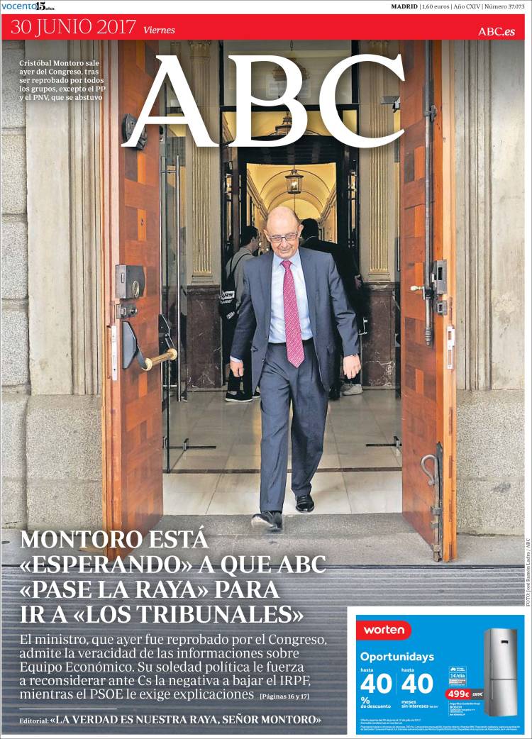 La resposta d'ABC a Montoro va ser un editorial on li recordava que una jutgessa ha admès una querella contra el seu ex despatx i hi deia coses com: "Más allá de que este periódico se sienta honrado con la «advertencia» del ministro, sus palabras suponen un ataque a la libertad de expresión y al derecho a la información impropio de quien ostenta tan alta responsabilidad pública. Montoro no ha desmentido lo publicado por este periódico y ha reconocido que estamos «midiendo el terreno», una apreciación que viene a confirmar que su malestar no responde a la falta de veracidad de las informaciones, sino al hecho de que utilicemos su imagen y su nombre, lo que añade más gravedad, si cabe, a su amenaza". I afegia: "Montoro debería saber que en un Estado de Derecho los límites a la libertad de expresión no los marca un ministro, sino la ley. Y que ABC, desde el más escrupuloso respeto al ordenamiento jurídico, seguirá informando por mucho que el titular de la cartera de Hacienda haya dejado claro que nos vigilará de cerca para ver si nos pasamos de la raya. Nuestra raya la tenemos muy clara: la verdad, por encima de todo (...) Quien ayer sobrepasó los límites fue el ministro de Hacienda".