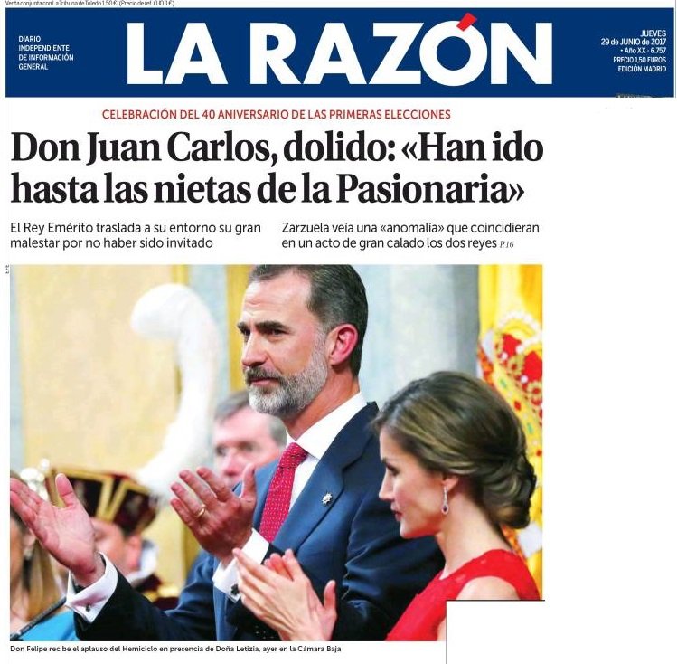 Amb l'ABC dedicat a Montoro, La Razón s'ha quedat en exclusiva l'exaltació dels 40 anys de pau... constitucional, però amb crítiques a l'absència del Rei Joan Carles l'Emèrit Primer. I crítiques poc dissimulades al fet: