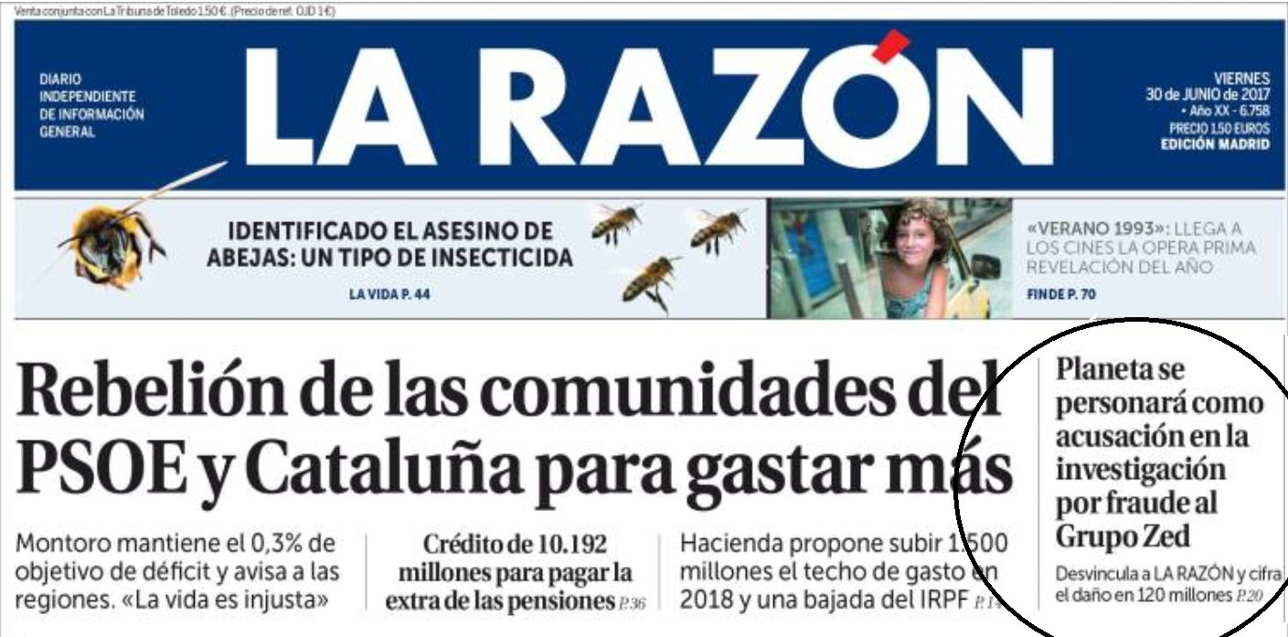 Madrit (concepte) bull. I la barca comença a tenir massa forats. Com el que afecta Mauricio Casals, president de La Razón. Casals, també home fort de Planeta, està sent investigat per l'UDEF com a presumpte mediador entre els ministeris d'Economia i Industria perquè el Grup ZED (dedicada als vídeojocs) rebés subvencions fraudulentes del Gobierno. Com van veure la noticia a El Mundo? És la marcada amb un cercle: