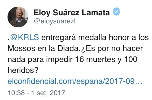 L'objectiu ha estat assolit i, com va passar amb la primera Operació Catalunya, s'ha creat una realitat paral·lela a la qual s'agafen els interessats en presentar-nos com una colla de corruptes que ara, a més, hem permès l'assassinat de 16 persones perquè estem obsessionats amb la independència. Com volem ser independents si som incapaços de gestionar un claríssim avís d'atemptat? Aquesta piulada del diputat del PP per Saragossa, Eloy Suárez Lamata (encara que després rectificada), és un bon exemple del clima que s'ha aconseguit crear: