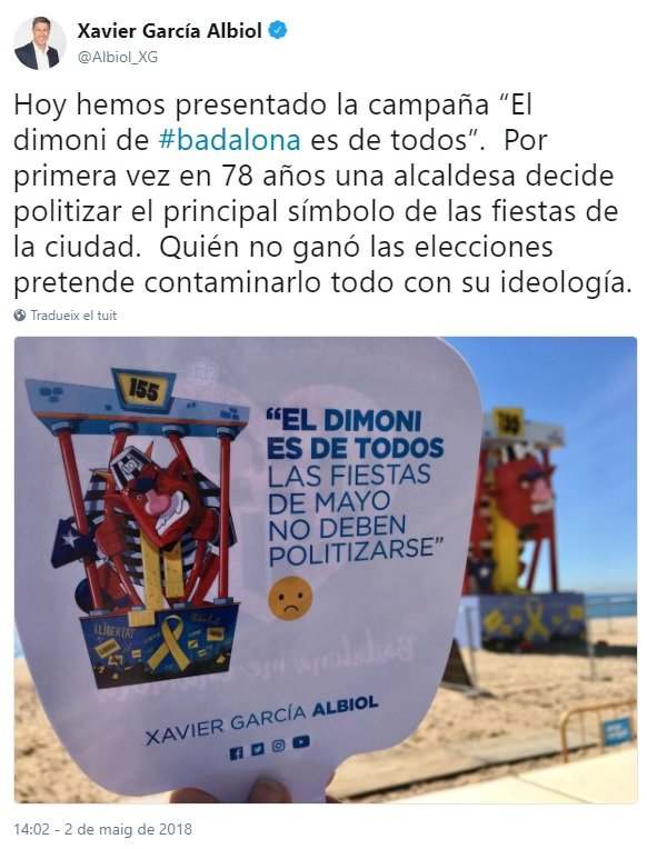 I ha afegit que alguna cosa greu passa quan el dimoni ha de ser protegit per tanques, insinuant que si aquest any no ho fessin així, els disconformes anirien a cremar-lo abans d'hora en senyal de protesta. Bé, suposo que el mateix que va passar l'any 2013, per exemple, quan el dimoni també estava envoltat de tanques. Ah, i en aquell moment l'alcalde de Badalona era Xavier García Albiol...