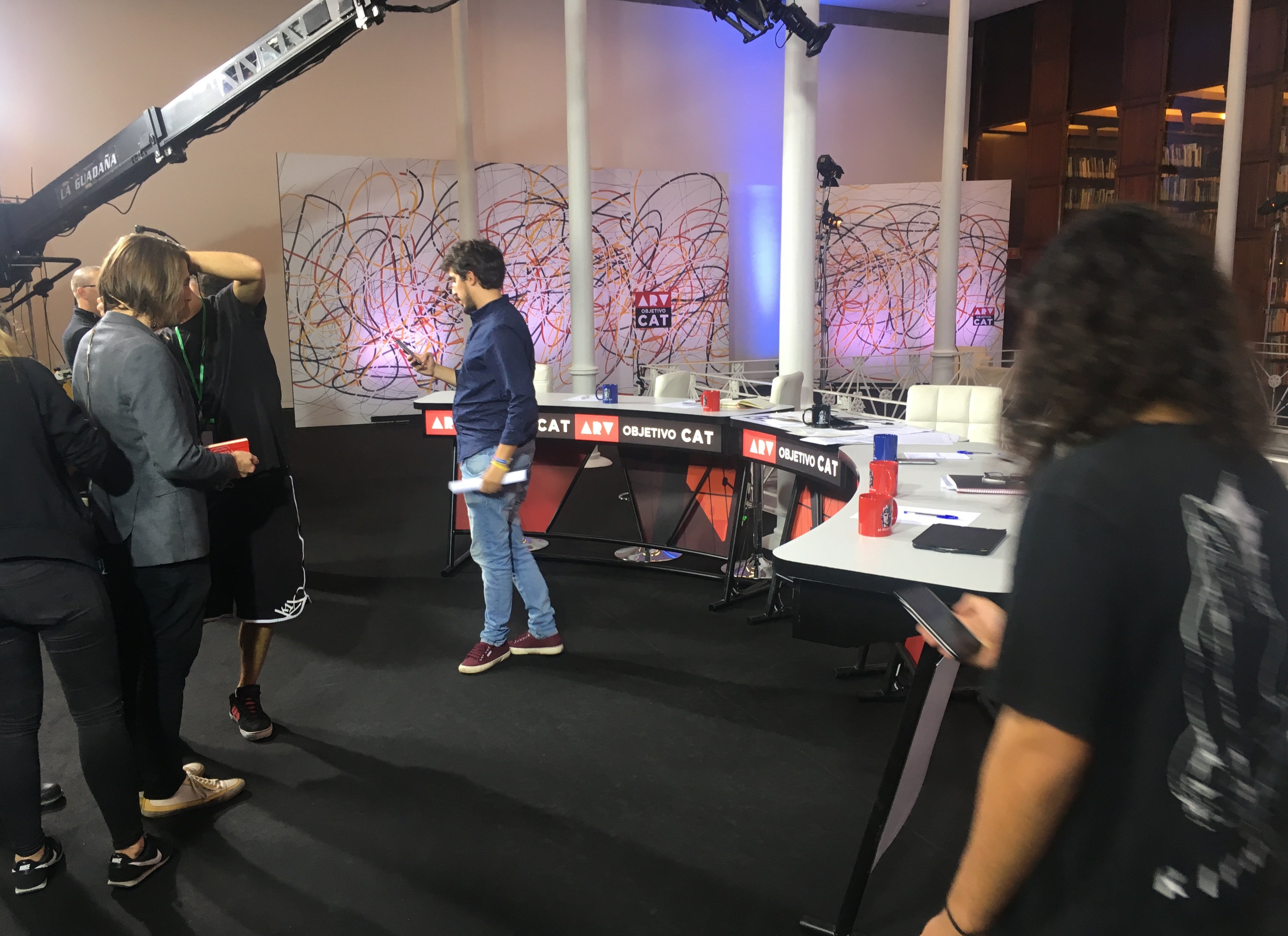 Total, que a un quart de cinc, net i polit i amb les meves millors gales, m'he presentat a la Fundació Tàpies de BCN. L'edifici sencer estava pres per la cadena. Al tercer pis, redacció, maquillatge, vestuari per als presentadors i càtering. El plató, situat al segon pis, era un espai petit, però no sé com hi han ficat 7 càmeres, la taula, els equips i un set addicional format per una tauleta i dues cadires per fer-hi entrevistes.