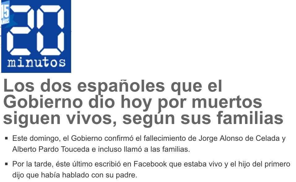 Això pel que fa al tema periodístic. Però l'altra vessant és increïble, intolerable i ha de significar la dimissió d'algú. I penso en el ministre responsable d'aquest desori. Com és possible que un Govern doni per morts dos dels seus ciutadans i ho comuniqui a les famílies sense fer ni tan sols una mínima confirmació? Però, això què és?