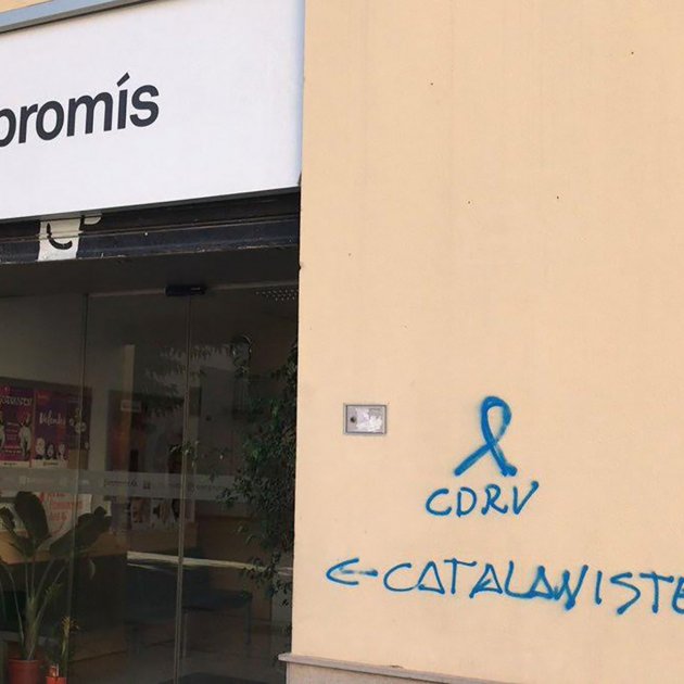 La seu nacional del partit polític Compromís a València ha estat objecte d’una altra pintada per part dels intolerants. Així ho ha denunciat la coalició al seu compte de twitter. Aquesta pintada s’afegeix a la que recentment patiren a la seu de Crevillent i en la que es podien llegir eslògans com “El Valle no se toca, ó assassins”. Ahir mateix la facultat de Psicología de la ciutat de València també va amanèixer amb pintades i slogans feixistes.