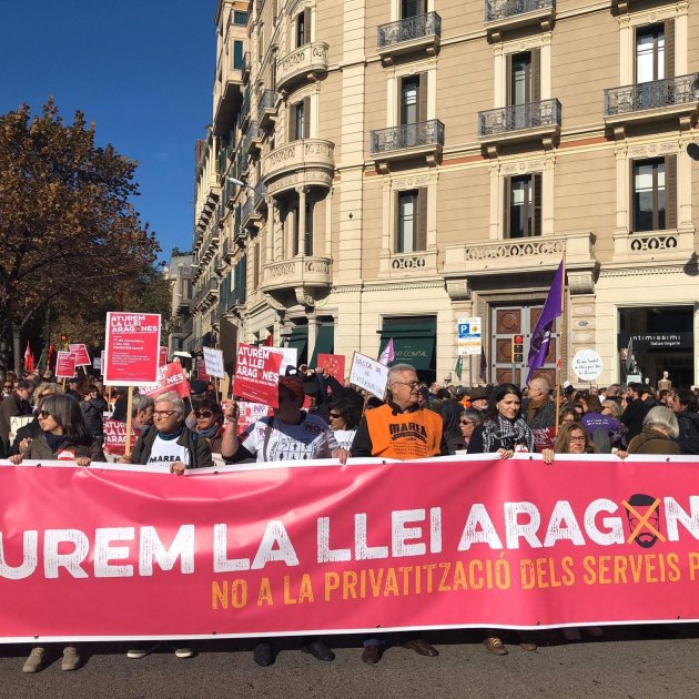Unes 2.500 persones, segons la Guàrdia Urbana, s'han manifestat aquest diumenge al migdia contra el projecte de llei de contractes de serveis a les persones que prepara la Generalitat ('Llei Aragonès') en considerar que "privatitza serveis públics" externalitzant la seva gestió cap a empreses privades no sotmeses a escrutini públic.