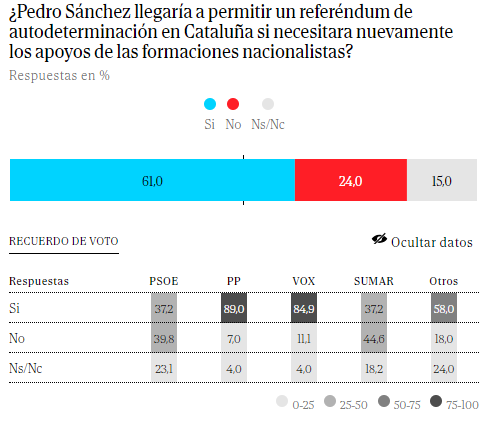 El 61% dels ciutadans de l'Estat espanyol creuen que el president del govern espanyol, Pedro Sánchez, arribaria a permetre un referèndum d'autodeterminació a Catalunya si tornés a necessitar els suports dels partits independentistes. Això és el que reflecteix una enquesta de Sigma Dos publicada per El Mundo, en la qual constata la divisió entre els votants del PSOE sobre elements com l'amnistia o el referèndum. Precisament, un 37,2% dels socialistes veurien possible que Sánchez acceptés un referèndum d'autodeterminació en cas que els socialistes tornessin a necessitar els suports de Junts i ERC. En canvi, un 39,8% dels votants socialistes espanyols creu que no ho acceptaria.