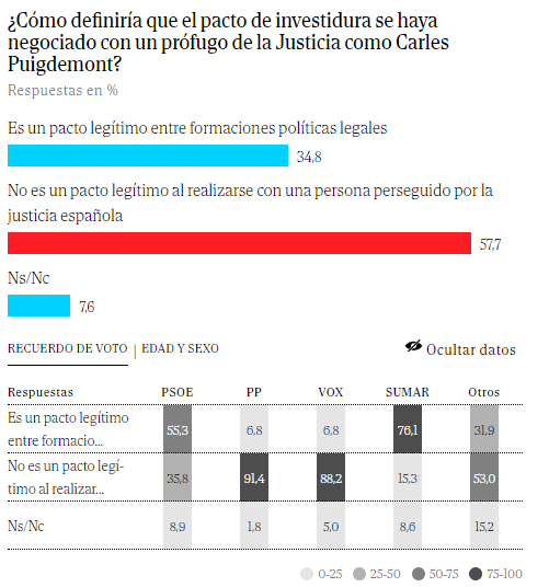 Així mateix, el 57,7% dels ciutadans de l'Estat espanyol consideren que l'acord amb el president a l'exili, Carles Puigdemont, és "il·legítim", ja que "és un fugitiu de la justícia". Entre els socialistes, el rebuig baixa al 35,8% i domina el 55,3% que sí que aprova haver pactat. Aquest patró es repeteix davant els verificadors, una altra cessió del PSOE a Junts per Catalunya: una majoria d'espanyols (48,3%) entén que "amplifica una imatge errònia de la qualitat de la democràcia espanyola", però la majoria dels socialistes se situa amb Sánchez, en la idea que "reforça la imatge democràtica" (52,9%).
