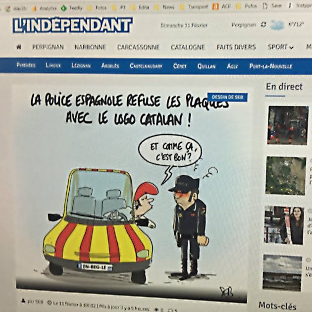 L'humorista SEB, de L'Indépendant, el diari de Perpinyà, es riu aquest diumenge de l'obsessió de la policia espanyola, a propòsit dels agents que han obligat dos conductors nord-catalans a retirar de la matrícula la bandera catalana que molts hi porten enganxada i que és plenament legal.