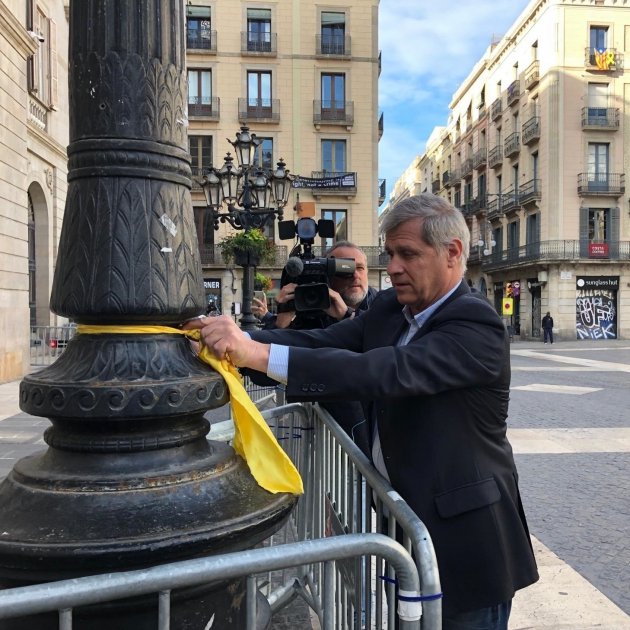 El líder del PP en l'Ajuntament de Barcelona, Alberto Fernández, ha tret aquest dimarts dos llaços grocs col·locats a dos fanals de la plaça Sant Jaume, davant del consistori, i ha proclamat: "L'Ajuntament ja torna a ser de tots, i l'espai públic ha de ser neutral".