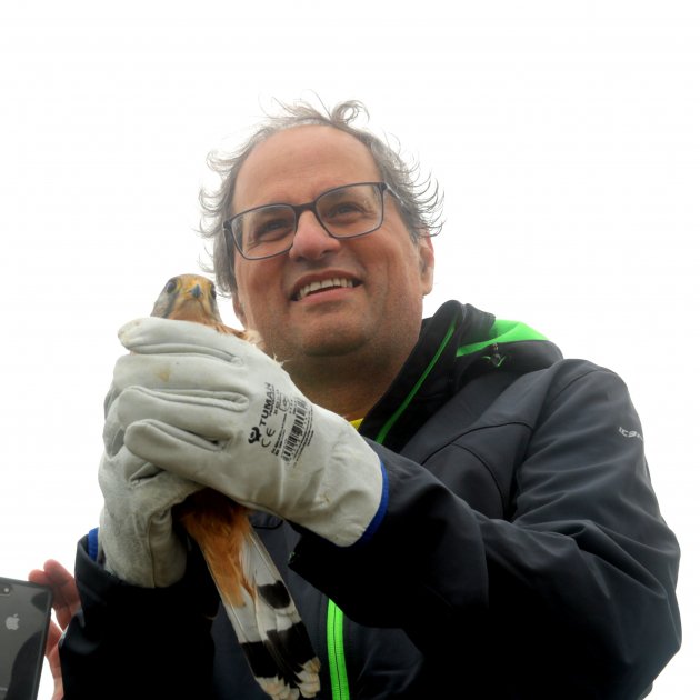 Equipat amb uns guants especials i sota l'expectació de centenars de persones que han fet l'excursió amb ell, el president ha dit "Llibertat pels presos polítics", i ha deixat anar l'au que ha marxat volant entre la boira.