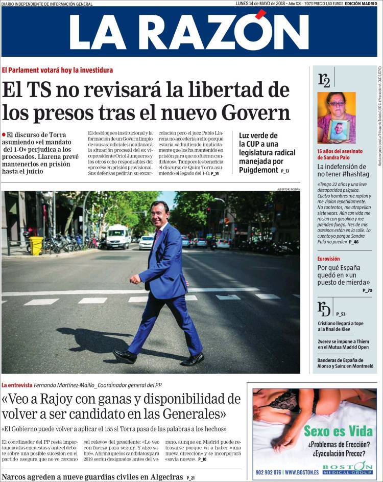 La investidura com a president de la Generalitat de Quim Torra no facilitarà la situació dels presos polítics sinó que, més aviat, la dificultarà. Així ho assegura el diari madrileny La Razón, que en la seva portada d’aquest dilluns inclou a tota plana una alerta a Quim Torra: “El TS no revisarà la llibertat dels presos després del nou Govern”, un avís que dona a entendre que l’elecció no ha agradat tampoc al jutge Llarena.