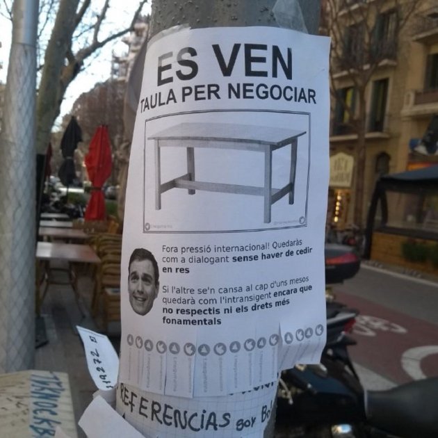 El moviment civil a favor de la república catalana, Marina Resisteix, ha creat un cartell força curiós. Amb un full DINA4 i, recreant amb ironia els anuncis per donar classes de repàs penjats als fanals de les ciutats, han penjat un anunci crític amb la mesa de diàleg entre els governs català i espanyol: "Es ven taula per negociar".