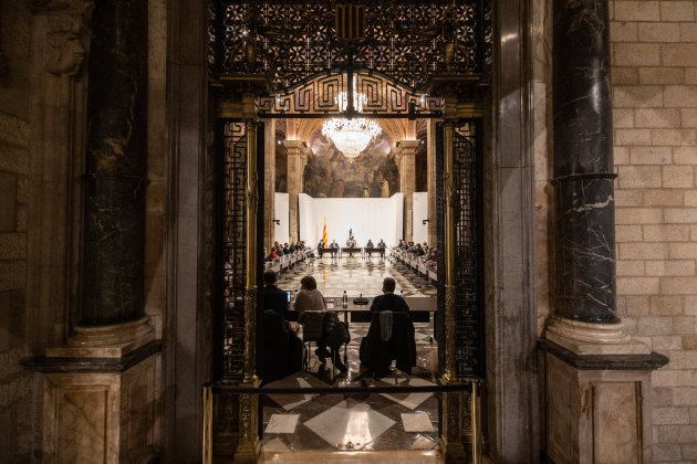 A la imatge principal, el president, Pere Aragonès, amb el conseller d'Educació, Josep Gonzàlez-Cambray, la consellera d'Universitats, Gemma Geis, i els representants de les entitats durant la compareixença al Saló Sant Jordi / Sergi Alcàzar