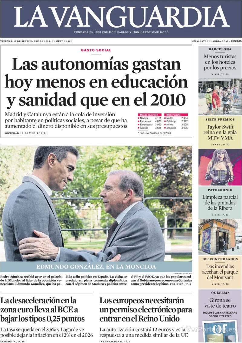 D'altra banda, les portades també es fan ressò de la discreta recepció d'Edmundo González per part del president del govern espanyol, Pedro Sánchez. El País apunta que "Sánchez dona un perfil baix a la seva recepció a Edmundo González", i molt similar el titular de l'ABC, que indica que ho veu com una "passejadeta sense reconeixement". Sánchez va rebre aquest dijous el líder opositor veneçolà al Palau de la Moncloa per traslladar-li que Espanya continuarà treballant “en favor de la democràcia, el diàleg i els drets fonamentals” del poble del país sud-americà. La cita a La Moncloa va tenir lloc un dia després que el Congrés, amb el vot en contra del PSOE, aprovés una proposició no de llei impulsada pel PP en què demanava al govern espanyol reconèixer com a president de Veneçuela González, que va arribar a Madrid diumenge passat per buscar asil davant la persecució del règim de Nicolás Maduro. Després de la reunió, no anunciada prèviament, Sánchez es va limitar a transmetre un missatge a través d'X, en què va assegurar que l'acollida del líder opositor mostra “el compromís humanitari i la solidaritat d'Espanya amb els veneçolans”. Molt poca pompa.