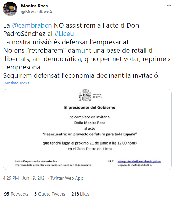 En el tuit, la presidenta de la Cambra exposa amb contundència els arguments pels quals declinen la invitació de Sánchez: "No ens 'retrobarem' damunt d'una base de retall de llibertats, antidemocràtica, que no permet votar, reprimeix i empresona", ha assegurat Roca, que ha indicat que la seva missió és "defensar l'empresariat" i que seguirà defensant l'economia declinant la invitació.