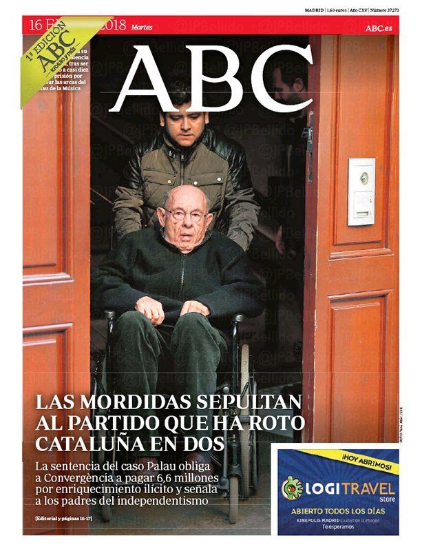 Obrint a tota portada amb una foto de Millet a la ja seva habitual cadira de rodes i sota el títol "Els pagaments sota mà sepulten el partit que ha trencat Catalunya en dos", l'ABC conclou que "Convergència va saquejar els catalans", però, com l'altre diari citat, subratlla que tot aquest "saqueig" s'ha fet "sota la coartada emocional de l'independentisme" per a, així, "delinquir sense miraments".