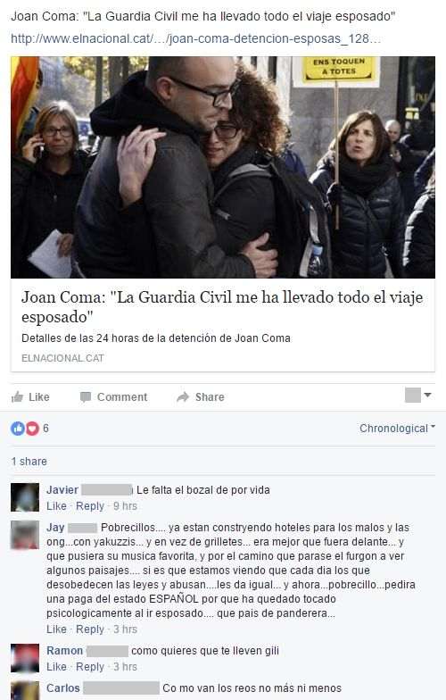 L'últim capítol de pressió contra el procés independentista, la detenció i declaració de Joan Coma a l'Audiència Nacional, i el periple pel que va passar durant 24 hores, ha desfermat comentaris contra ell i contra els catalans a les xarxes. La versió en castellà de la notícia de El Nacional, on Coma explica els detalls de la detenció, ha desfermat els atacs a Facebook.